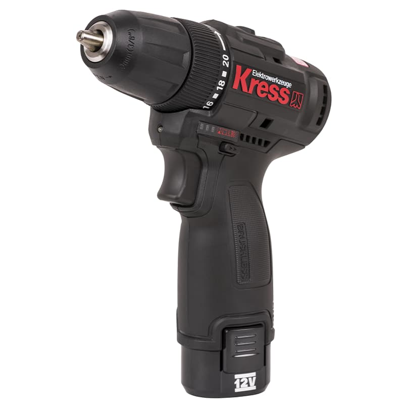Имеет быстрозажимной 10 мм патрон с блокировкой шпинделя, фиксация оснастки одной рукой. А также 2 рабочие скорости, одна предназначена для работы с крепежом, а вторая для сверления. Наличие муфты регулировки крутящего момента(20+1 позиций ступеней) позволит максимально точно выбрать режим работы. Дрель оснащена светодиодной подсветкой рабочей зоны. Поставляется в комплекте с 2-мя аккумуляторами KRESS 12В 2 А*ч. Аккумуляторы KRESS оснащены электронной платой управления с защитой от глубокого разряда и перегрева, что продлевает срок службы и увеличивает время работы. Данная модель поставляется в кейсе.